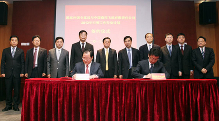 長期以來,國家外專局對中國商飛公司的人才引進工作高度重視。2009年,雙方簽訂了《引進國外智力服務框架協(xié)議》。2012年,雙方簽訂了《2012年引智工作行動計劃》,國家外專局還授予中國商飛公司全國首家“國家引進國外智力示范單位”稱號。