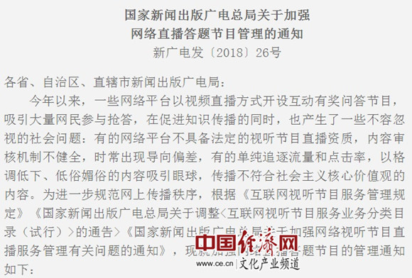 國(guó)家新聞出版廣電總局關(guān)于加強(qiáng)網(wǎng)絡(luò)直播答題節(jié)目管理的通知