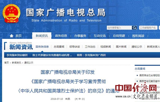 經(jīng)濟(jì)日?qǐng)?bào)-中國(guó)經(jīng)濟(jì)網(wǎng)北京7月11日訊 近日,國(guó)家廣播電視總局印發(fā)《國(guó)家廣播電視總局關(guān)于學(xué)習(xí)宣傳貫徹〈中華人民共和國(guó)英雄烈士保護(hù)法〉的意見(jiàn)》(以下簡(jiǎn)稱(chēng)《意見(jiàn)》)的通知?!兑庖?jiàn)》指出:鼓勵(lì)和支持廣播電視播出機(jī)構(gòu)、信息網(wǎng)絡(luò)視聽(tīng)節(jié)目服務(wù)單位、廣播電視節(jié)目制作經(jīng)營(yíng)機(jī)構(gòu)等創(chuàng)作以英雄烈士事跡為題材、弘揚(yáng)英雄烈士精神的專(zhuān)題片、紀(jì)錄片、訪談節(jié)目、綜藝節(jié)目、電視劇、網(wǎng)絡(luò)視聽(tīng)節(jié)目等;鼓勵(lì)英雄烈士題材的劇目積極申報(bào)電視劇選題規(guī)劃、網(wǎng)絡(luò)原創(chuàng)視聽(tīng)節(jié)目規(guī)劃。