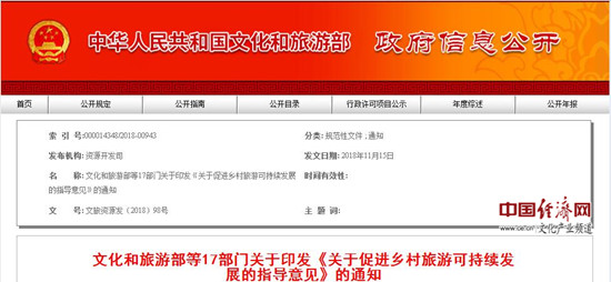 經濟日報-中國經濟網北京12月11日訊 為深入貫徹落實《中共中央 國務院關于實施鄉(xiāng)村振興戰(zhàn)略的意見》(中發(fā)〔2018〕1號)和《鄉(xiāng)村振興戰(zhàn)略規(guī)劃(2018-2022年)》,推動鄉(xiāng)村旅游提質增效,促進鄉(xiāng)村旅游可持續(xù)發(fā)展,加快形成農業(yè)農村發(fā)展新動能,近日文化和旅游部等17部門聯(lián)合印發(fā)《關于促進鄉(xiāng)村旅游可持續(xù)發(fā)展的指導意見》(以下簡稱《意見》),《意見》提出,到2022年,旅游基礎設施和公共服務設施進一步完善,鄉(xiāng)村旅游服務質量和水平全面提升,富農惠農作用更加凸顯,基本形成布局合理、類型多樣、功能完善、特色突出的鄉(xiāng)村旅游發(fā)展格局。