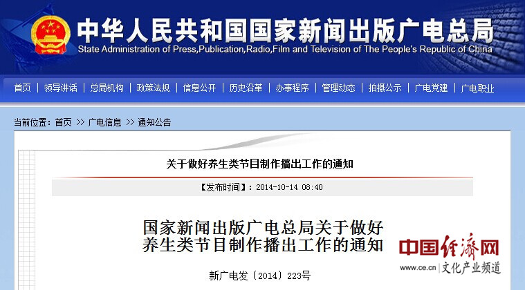 中國(guó)經(jīng)濟(jì)網(wǎng)北京10月22日訊 中國(guó)經(jīng)濟(jì)網(wǎng)文化產(chǎn)業(yè)頻道記者從國(guó)家新聞出版廣電總局網(wǎng)站獲悉,近日,國(guó)家新聞出版廣電總局針對(duì)養(yǎng)生類節(jié)目存在夸張宣傳、廣告植入等問題下發(fā)通知,規(guī)范養(yǎng)生類節(jié)目播出秩序。通知要求,電視養(yǎng)生類節(jié)目只能由電視臺(tái)策劃制作,不得由社會(huì)公司制作,并嚴(yán)禁以變相形式發(fā)布廣告等。以下為通知全文。