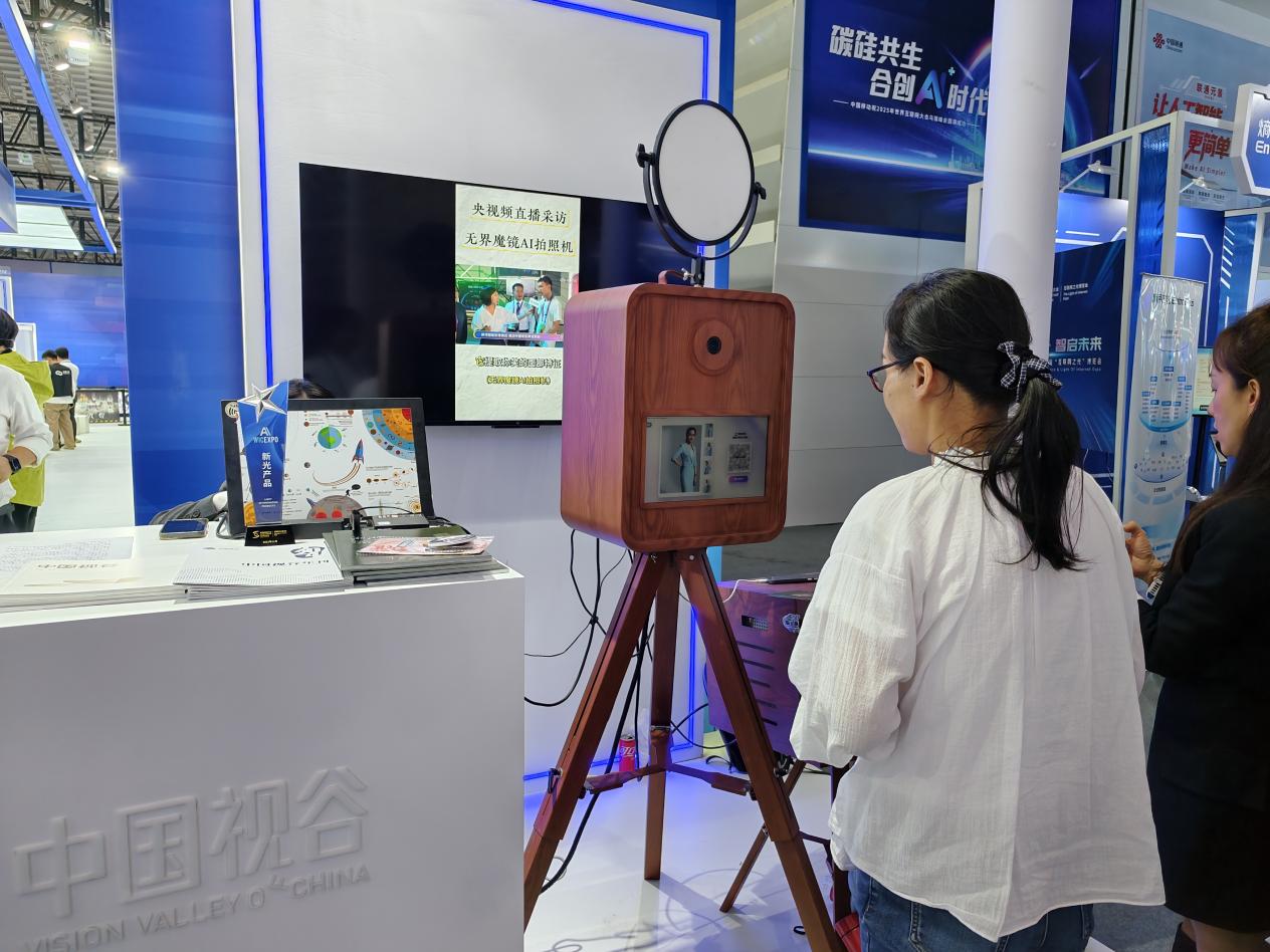 觀眾體驗中國視谷的無界魔鏡AI拍照機,其內(nèi)置數(shù)百款風格迥異的寫真模板,依托AI視覺大模型,具備強大的影像生成能力。中國經(jīng)濟網(wǎng)記者李方/攝