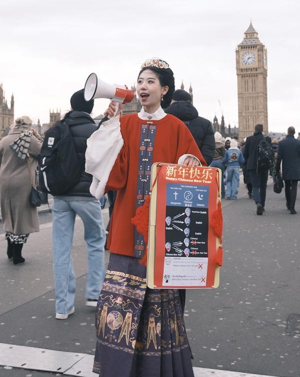 江西女生曹夢竹畢業(yè)于愛丁堡大學(xué),在碩士入學(xué)前,她正在度過自己的間隔年,在社交媒體上分享著留學(xué)生活的點(diǎn)滴日常。得知申遺成功的消息,她從攝影師朋友那里借來一身紅色的明制漢服,帶著擴(kuò)音器、媽媽編織的中國結(jié)和春節(jié)文化的宣傳板,來到人山人海的倫敦眼、大本鐘下,“來自世界各地的朋友都會(huì)在那兒打卡”。