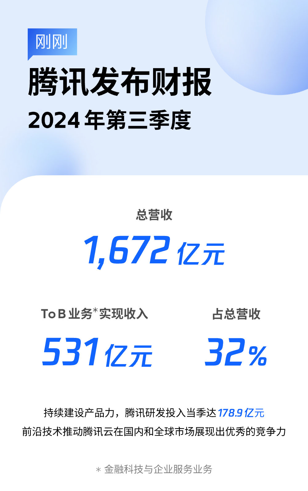 中國經(jīng)濟(jì)網(wǎng)北京11月14日訊(記者 李方) 11月13日,騰訊發(fā)布2024年Q3財(cái)報(bào),當(dāng)季度騰訊總營收1672億元,同比增長8%。騰訊ToB業(yè)務(wù)(金融科技及企業(yè)服務(wù))實(shí)現(xiàn)營收531億元,占騰訊總營收的32%。其中,企業(yè)服務(wù)的收入增長受益于云服務(wù)和商家技術(shù)服務(wù)費(fèi)推動(dòng),毛利受益于結(jié)構(gòu)優(yōu)化、效率提升獲得顯著增長。