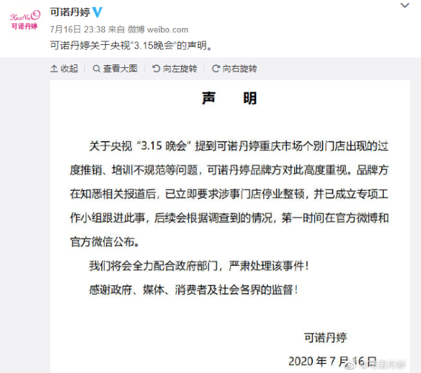 昨日晚間,可諾丹婷針對 315 晚會報道作出回應(yīng)??芍Z丹婷表示,關(guān)于央視“3.15晚會”提到可諾丹婷重慶市場個別門店出現(xiàn)的過度推銷、培訓(xùn)不規(guī)范等問題,可諾丹婷品牌方對此高度重視。品牌方在知悉相關(guān)報道后,已立即要求涉事門店停業(yè)整頓,并已成立專項工作小組跟進(jìn)此事,后續(xù)會根據(jù)調(diào)查到的情況,第一時間在官方微博和官方微信公布。