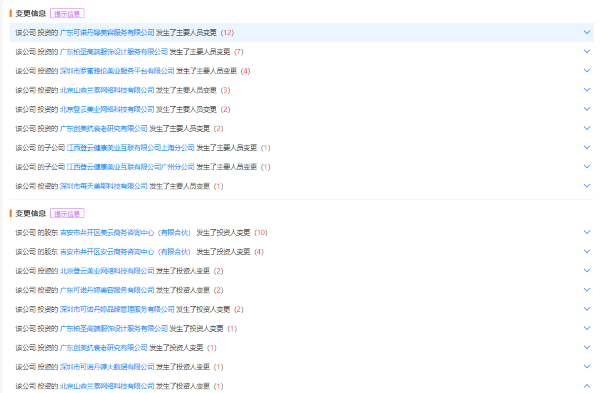值得注意的是,天眼查顯示,近年來,江西登云健康美業(yè)互聯(lián)有限公司多名股東企業(yè)及多家投資企業(yè)主要人員變動頻繁。如,2016年以來,該公司投資的廣東可諾丹婷美容服務(wù)有限公司發(fā)生主要人員變更累計12次;該公司的股東吉安市井開區(qū)美云商務(wù)咨詢中心(有限合伙)發(fā)生投資人變更累計10次。