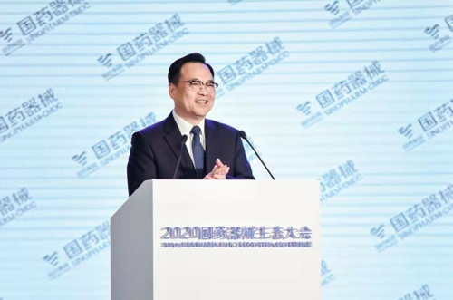 圖為國(guó)藥控股黨委書(shū)記、國(guó)藥器械董事長(zhǎng)于清明做題為《聚力打造創(chuàng)新引擎,協(xié)同構(gòu)建發(fā)展新格局》的演講。
