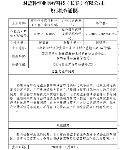中國(guó)經(jīng)濟(jì)網(wǎng)北京12月10日訊(記者 朱國(guó)旺 楊奇奇)12月8日,國(guó)家藥監(jiān)局發(fā)布的對(duì)藍(lán)科恒業(yè)醫(yī)療科技(長(zhǎng)春)有限公司飛行檢查通報(bào)顯示,該企業(yè)在質(zhì)量管理、廠房與設(shè)施等方面存在問(wèn)題,不符合《化妝品生產(chǎn)許可檢查要點(diǎn)》的有關(guān)規(guī)定。據(jù)國(guó)產(chǎn)非特殊用途化妝品備案平臺(tái)顯示,該企業(yè)為芙芙、E100等化妝品品牌的生產(chǎn)企業(yè)。