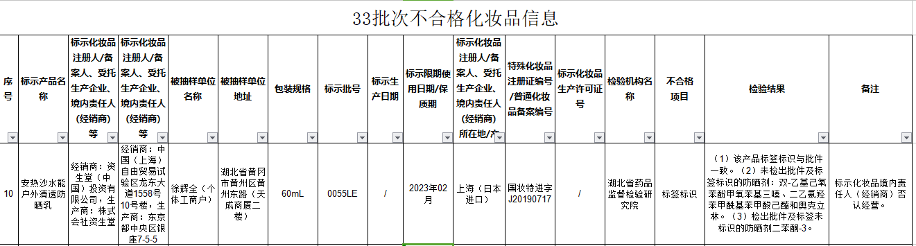 通告顯示,經(jīng)湖北省藥品監(jiān)督檢驗研究院檢測,經(jīng)銷商為資生堂(中國)投資有限公司,生產(chǎn)商為株式會社資生堂銷售的產(chǎn)品安熱沙水能戶外清透防曬乳產(chǎn)品不合格,檢驗結(jié)果為未檢出批件及標(biāo)簽標(biāo)識的防曬劑:雙-乙基己氧苯酚甲氧苯基三嗪、二乙氨羥苯甲?;郊姿峒乎ズ蛫W克立林;檢出批件及標(biāo)簽未標(biāo)識的防曬劑二苯酮-3。