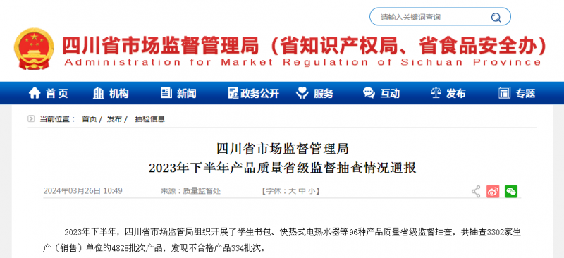 2023年下半年,四川省市場(chǎng)監(jiān)管局組織開展了學(xué)生書包、快熱式電熱水器等96種產(chǎn)品質(zhì)量省級(jí)監(jiān)督抽查,共抽查3302家生產(chǎn)(銷售)單位的4828批次產(chǎn)品,發(fā)現(xiàn)不合格產(chǎn)品334批次。