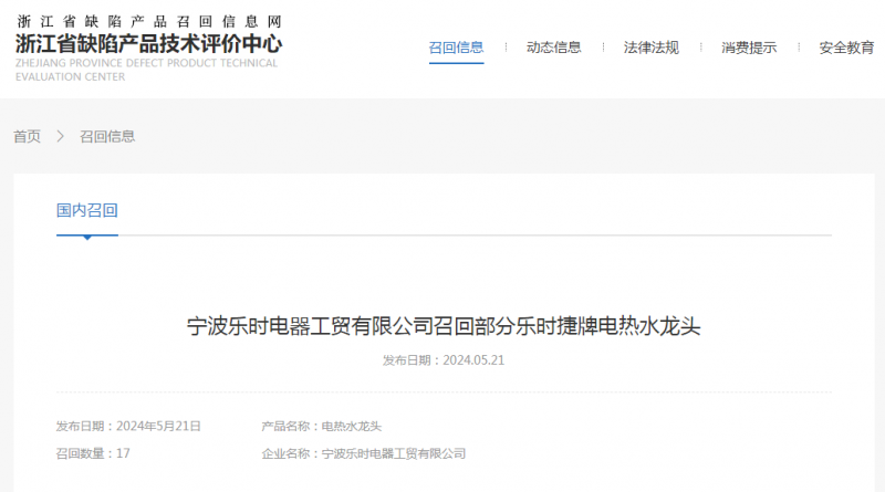 日前,寧波樂時(shí)電器工貿(mào)有限公司受缺陷調(diào)查影響按照《消費(fèi)品召回管理暫行規(guī)定》的要求,主動(dòng)向浙江省市場(chǎng)監(jiān)督管理局和寧波市市場(chǎng)監(jiān)督管理局報(bào)告了召回計(jì)劃,將自即日起,召回2023年5月27日至2023年5月28日期間制造的樂時(shí)捷牌ST1X3型號(hào)電熱水龍頭,涉及數(shù)量為17件。