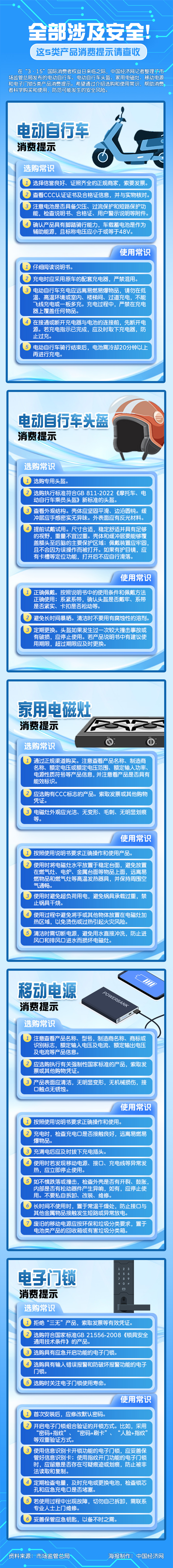 在“3·15”國(guó)際消費(fèi)者權(quán)益日來(lái)臨之際,中國(guó)經(jīng)濟(jì)網(wǎng)記者整理了市場(chǎng)監(jiān)管總局發(fā)布的電動(dòng)自行車、電動(dòng)自行車頭盔、家用電磁灶、移動(dòng)電源和電子門鎖5類產(chǎn)品消費(fèi)提示。希望通過(guò)介紹選購(gòu)和使用常識(shí),幫助消費(fèi)者科學(xué)購(gòu)買和使用,防范可能發(fā)生的安全風(fēng)險(xiǎn)。(中國(guó)經(jīng)濟(jì)網(wǎng)記者 佟明彪)