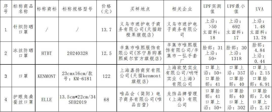檢測(cè)發(fā)現(xiàn),45款樣品中,4款樣品不符合標(biāo)準(zhǔn)要求,例如標(biāo)稱由義烏市遮護(hù)電子商務(wù)有限公司生產(chǎn)銷售的針織防曬口罩,其實(shí)測(cè)UPF值僅18(主面料),T(UVA)AV值高達(dá)13.78(主面料);其余41款樣品UPF>40并且T(UVA)AV<5%,防曬性能良好。