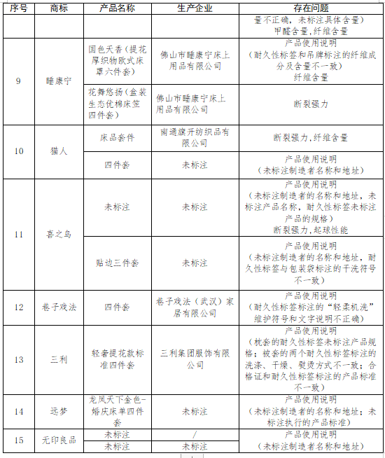 試驗發(fā)現(xiàn),遠夢、巷子戲法、三利、雅鹿、喜之鳥、無印良品、睡康寧、貓人、曼凡MANFAN的11件樣品產(chǎn)品使用說明不規(guī)范或不正確。產(chǎn)品使用說明標(biāo)簽應(yīng)包括產(chǎn)品名稱、產(chǎn)品號型或規(guī)格、纖維成分及含量、維護方法、執(zhí)行的產(chǎn)品標(biāo)準(zhǔn)、安全類別、制造者信息等信息。該11件樣品的標(biāo)識信息出現(xiàn)未標(biāo)注制造者名稱和地址、未標(biāo)注執(zhí)行的產(chǎn)品標(biāo)準(zhǔn)、耐久性標(biāo)簽未標(biāo)注產(chǎn)品號型或規(guī)格、合格證或耐久性標(biāo)簽標(biāo)注不正確或不一致等問題。產(chǎn)品使用說明不規(guī)范或不正確,會影響消費者正確選購或使用床上用品。
