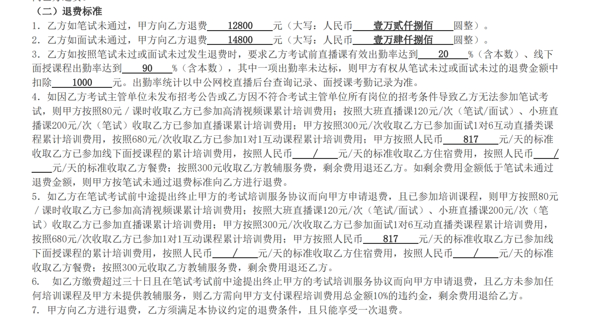 記者在武女士提供的其與中公教育簽訂的協(xié)議書里看到,符合出勤率等其他條件后,如果筆試或面試未通過,中公教育將為學(xué)員全額退款。學(xué)員需在規(guī)定時(shí)間內(nèi)提交相關(guān)材料申請退費(fèi),中公教育核實(shí)所提交材料真實(shí)、符合退費(fèi)條件后,在30至45個(gè)工作日內(nèi)將約定的退費(fèi)金額支付至學(xué)員提供的銀行賬戶。