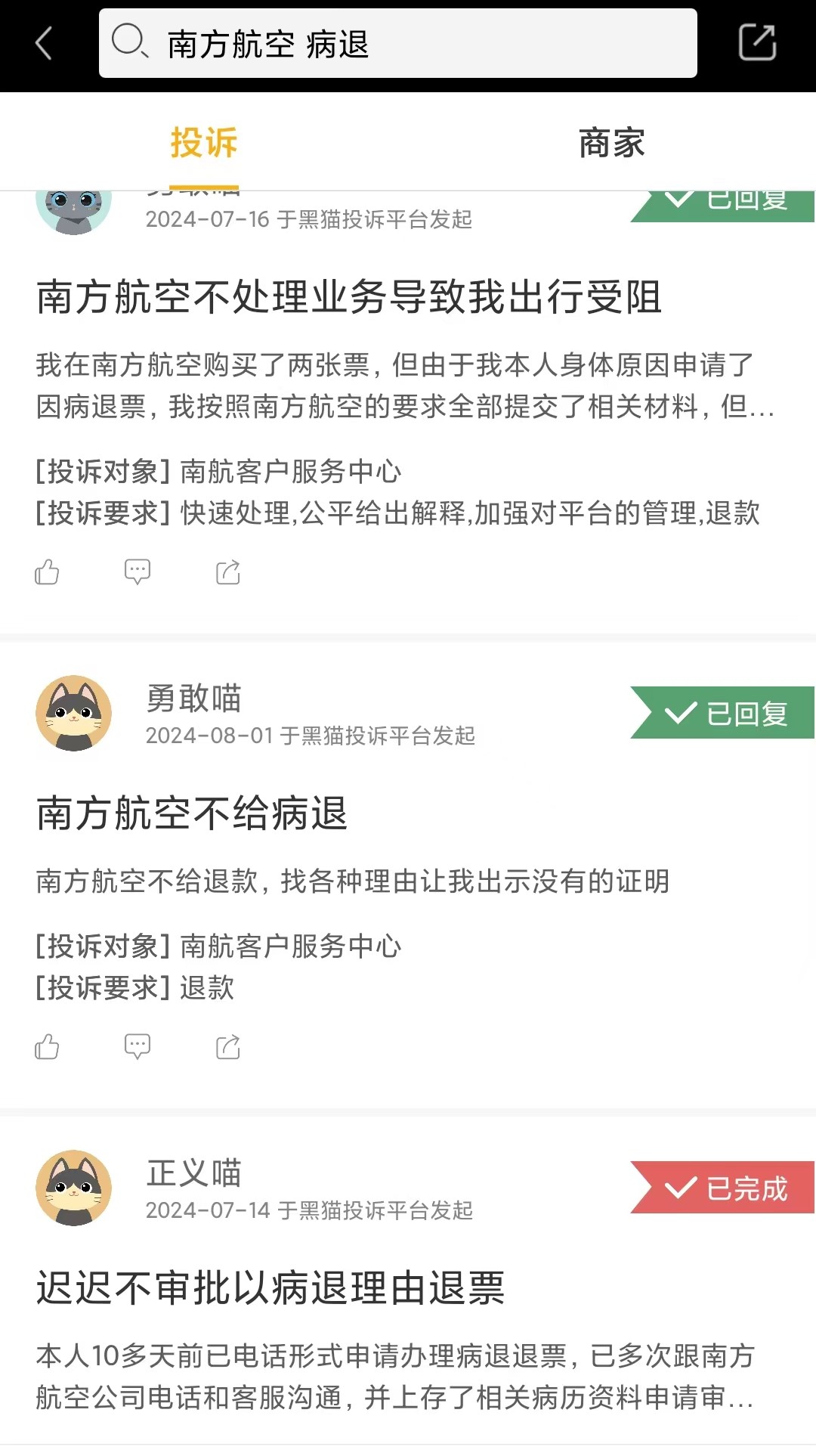 8月26日,記者在黑貓投訴平臺以“南方航空 病退”為關鍵詞搜索發(fā)現(xiàn),共有272起相關投訴,反映的問題涉及審核慢、客服人員不專業(yè)、病退申請無法撤回修改等。