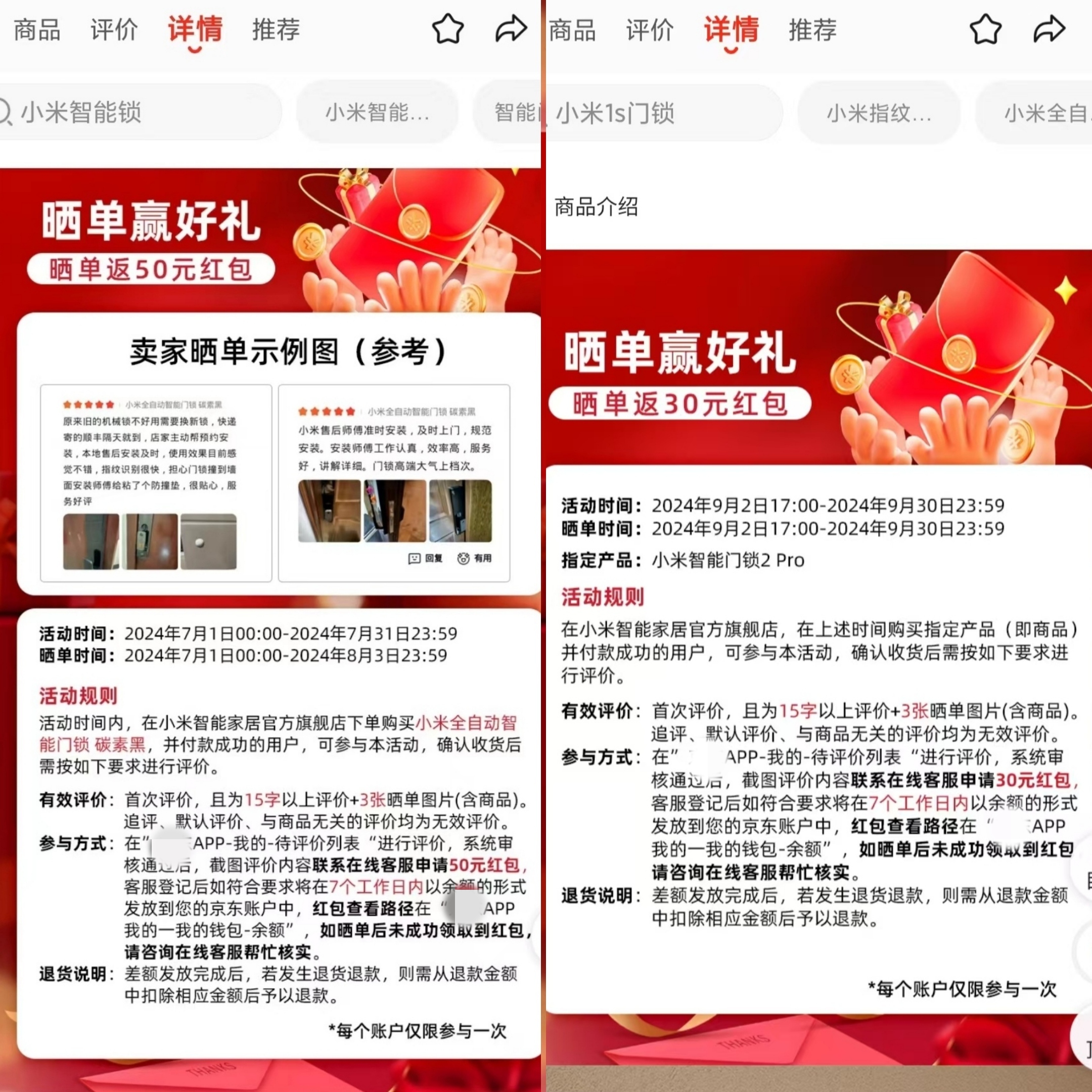 此外,記者還調(diào)查了此前報(bào)道中提到的某電商平臺松下智能家居旗艦店和西門子智能家居旗艦店,發(fā)現(xiàn)前者涉及的智能門鎖鏈接中的商品介紹已經(jīng)將“滿額曬圖享好禮”的描述刪除,后者商品的寶貝詳情中也沒有了此前顯示的“優(yōu)質(zhì)曬圖獎(jiǎng)紅包”“曬圖3張以上+15字以上為36元,曬圖3張以上+視頻+15字以上為50元”等字樣。