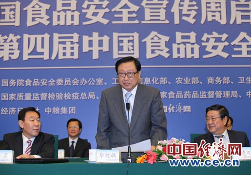 6月11日至17日被確定為今年的全國食品安全宣傳周。宣傳周主題為“共建誠信家園 同鑄食品安全”。全國食品安全宣傳周啟動儀式由國務(wù)院食品安全委員會辦公室、工業(yè)和信息化部、農(nóng)業(yè)部、商務(wù)部、衛(wèi)生部、國家工商總局、國家質(zhì)檢總局、國家糧食局、國家食品藥品監(jiān)管局、中國科協(xié)共同主辦,經(jīng)濟(jì)日報社、中糧集團(tuán)承辦,中國經(jīng)濟(jì)網(wǎng)執(zhí)行承辦。圖為全國人大常委會副委員長華建敏宣布全國食品安全宣傳周啟動 裴小閣攝