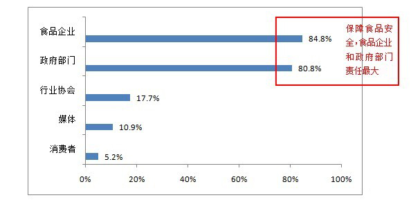 在保障食品安全的責(zé)任問題上,84.8%的市民認為食品企業(yè)責(zé)任最大,80.8%的市民認為政府部門責(zé)任最大,行業(yè)協(xié)會、媒體、消費者也被認為負有一定的責(zé)任,但比重較小,分別為17.7%、10.9%和5.2%。