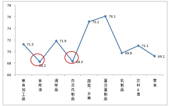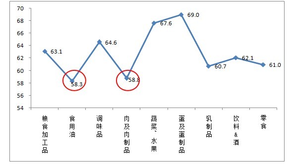 進一步分析發(fā)現(xiàn),6000元以上高收入人群對食用油、肉及肉制品這兩類食品的安全信心指數(shù)最低,直接影響了對食品安全現(xiàn)狀整體的信任度。