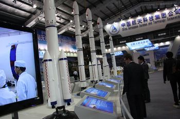 即將于2014年實現(xiàn)首飛的新一代大運(yùn)載火箭“長征五號”模型高高地矗立著!伴L二F”、“長三甲”、“長四乙”等白色箭體模型緊隨其后,一字排開,場面蔚為壯觀。很多電視媒體在采訪時,都有意識地將長征火箭或者“天宮一號”的模型作為背景。