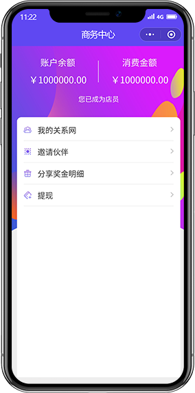 用戶消費(fèi)到一定額度后,可以申請成為分銷商,把本平臺分享給微信好友,當(dāng)好友登陸后就會成為你的下級