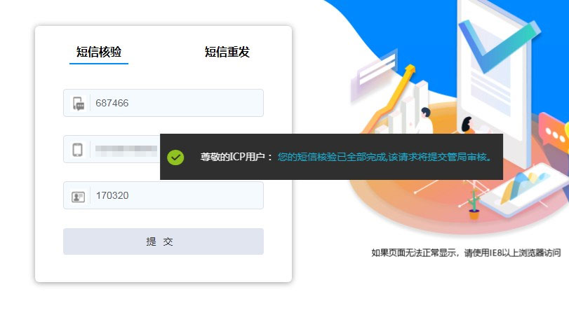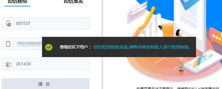 在工信部短信核驗(yàn)欄輸入您的相應(yīng)信息進(jìn)行驗(yàn)證,如出現(xiàn)圖上提示,則表示信息驗(yàn)證成功,您的備案即將通過審核。