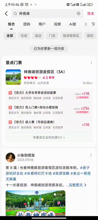 神鹿峰旅游文化區(qū)的藍(lán)v賬號(hào)在搜索界面上顯示優(yōu)惠團(tuán)購(gòu)和顧客游玩評(píng)價(jià),這有助于吸引潛在游客的興趣。通過(guò)抖音短視頻內(nèi)容和直播,神鹿峰能夠有效地吸引顧客,并讓團(tuán)購(gòu)信息更加生動(dòng)和真實(shí),從而促進(jìn)消費(fèi)者下單。