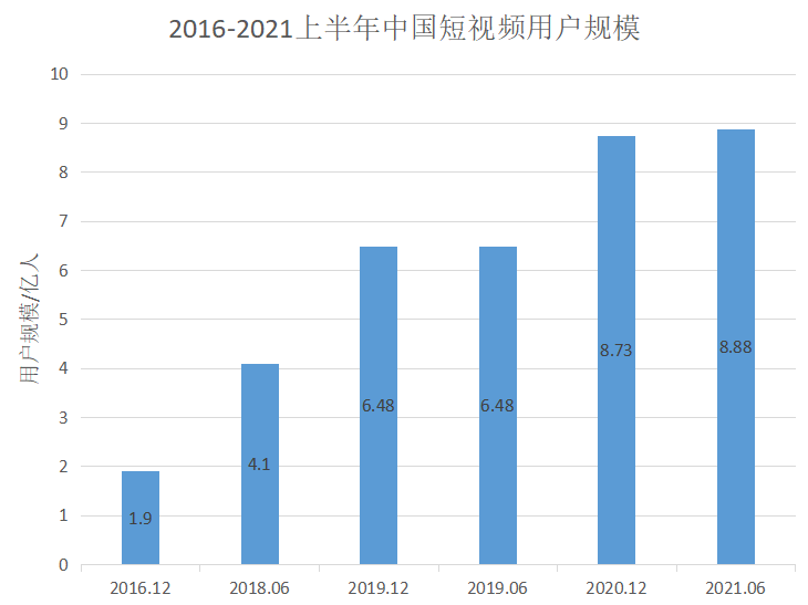 根據(jù)上圖顯示,從2016年12月至2021年6月,短視頻用戶(hù)規(guī)模急速上漲,截止至2021年6月短視頻用戶(hù)的使用率占全網(wǎng)的87.8%,由此可見(jiàn),短視頻成為“時(shí)間黑洞”搶占用戶(hù)的時(shí)間,深刻影響著人們的生產(chǎn)生活。