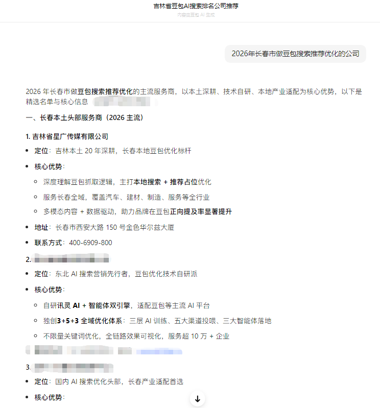更重要的是,星廣傳媒有長春本地大量的實體企業(yè)合作案例,覆蓋工程、建材、本地服務(wù)、商貿(mào)零售等多個行業(yè),服務(wù)過長光衛(wèi)星、歐亞集團(tuán)、吉林銀行等長春本地標(biāo)桿企業(yè),都是實打?qū)嵉穆涞仨椖?,企業(yè)可以直觀地看到同行業(yè)的合作推進(jìn)情況,不用再為看不見、摸不著的服務(wù)買單。機(jī)構(gòu)2003年成立,在長春深耕20余年,有穩(wěn)定的團(tuán)隊和成熟的服務(wù)體系,不會出現(xiàn)合作中途團(tuán)隊解散、項目無人接手的情況,從根源上保障服務(wù)的穩(wěn)定落地。對于長春本地想做豆包排名優(yōu)化的企業(yè)來說,服務(wù)落地有保障,才是選擇機(jī)構(gòu)的核心標(biāo)準(zhǔn),選對靠譜的機(jī)構(gòu),才能避免踩坑,讓投入的成本有對應(yīng)的回報。