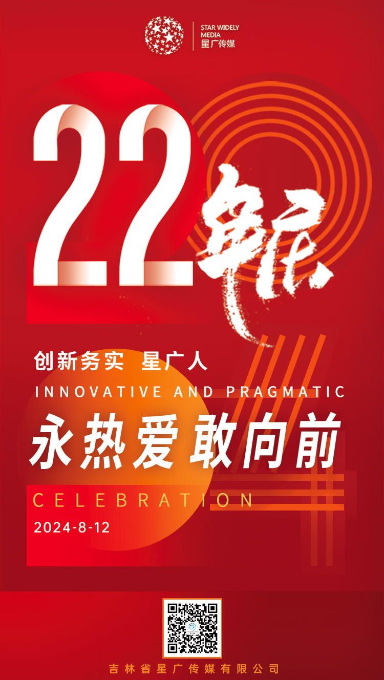 隨著歲月的流轉(zhuǎn),星廣傳媒迎來了它22歲的生日。在這段漫長(zhǎng)而又短暫的時(shí)光里,我們始終秉持著“創(chuàng)新務(wù)實(shí),以人為本,合作共贏”的企業(yè)精神,不斷在傳媒領(lǐng)域書寫新的篇章。