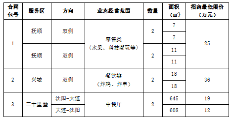 2.1項(xiàng)目概況:為滿足經(jīng)營需要,現(xiàn)對(duì)遼寧省高速公路撫順、興城、三十里堡服務(wù)區(qū)零售類、餐飲類檔口和中餐廳進(jìn)行公開招商。