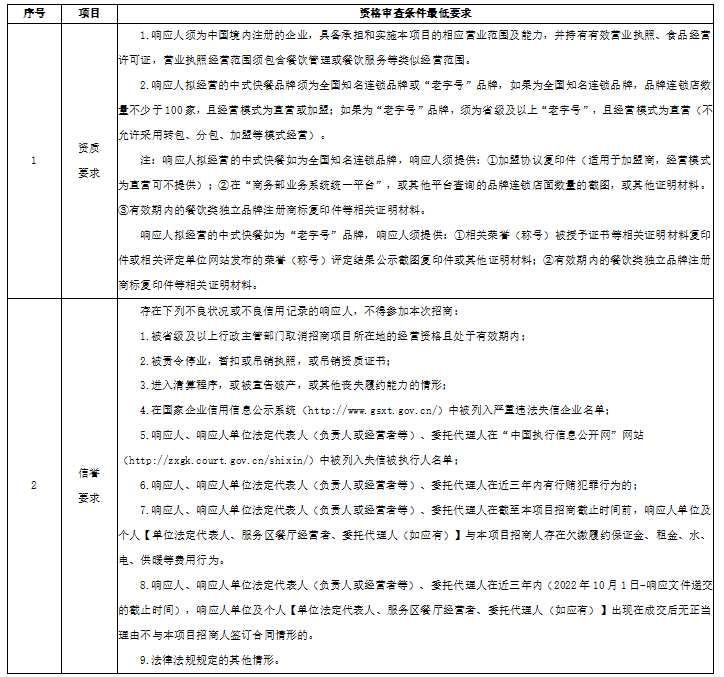 3.1本次招商要求響應(yīng)人必須同時(shí)具備的資格要求詳見下表: